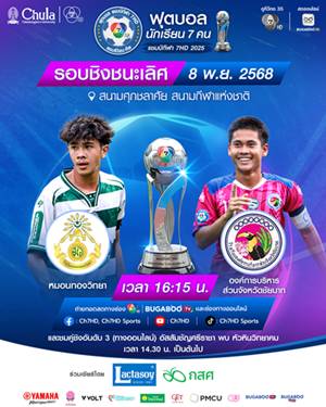 ฟุตบอลแชมป์กีฬา 7 HD วันเสาร์ที่ 8 พฤศจิกายน 2568 เริ่มคู่แรก เวลา 14.30 น. ชิงอันดับ 3 อัสสัมชัญศรีราชา พบ หัวหินวิทยาคม ส่วนคู่ชิงชนะเลิศ หมอนทองวิทยา พบ อบจ.ชัยนาท ช่อง 7HD ถ่ายทอดสด เริ่มแข่งขันในเวลา 16.15 น. พร้อมกับทางออนไลน์ หรือเข้าไปชมแบบติดขอบสนาม ที่สนามศุภชลาศัย เข้าชมฟรี